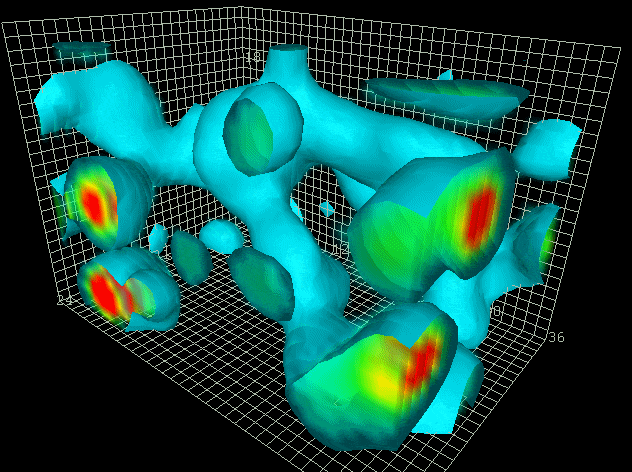 Quantum field theory represents quantum mechanics with the idea of fields. It talks about the creation and annihilation of particles and their interactions with fields. In this view, there is no such thing as empty space because quantum fields are present everywhere throughout the universe. However, particles are only present when an excitation of a field reaches a certain level. Here is a depiction of a very small subset of space. The red areas are excitations where a particle becomes actualized. Contrary to the earlier substance model of reality, what quantum field theory says is that the universe is in constant flux where particles come and go. In this model, the field waves are constantly interacting with one another, causing interferences that either reduce or enhance the likelihood of an actualization.